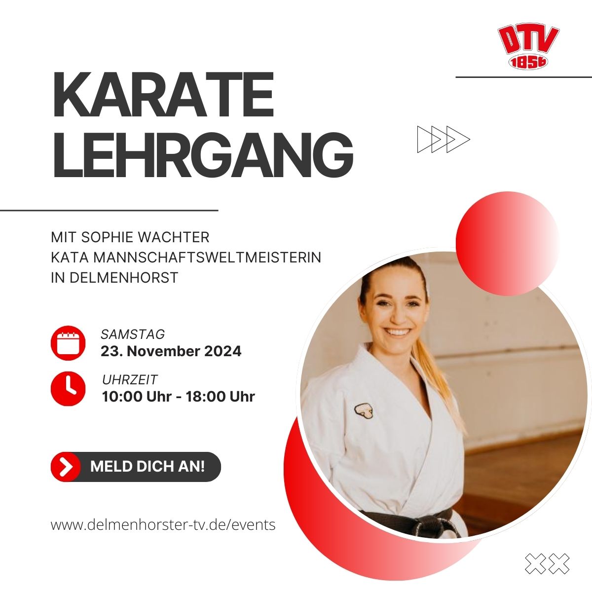KARATE | SOPHIE WACHTER IN DELMENHORST! Die Kata Mannschaftsweltmeisterin gibt bei uns einen Lehrgang. Trag dir den Termin gleich ein und melde dich an. Alle Informationen findest du unter www.delmenhorster-tv.de/events/